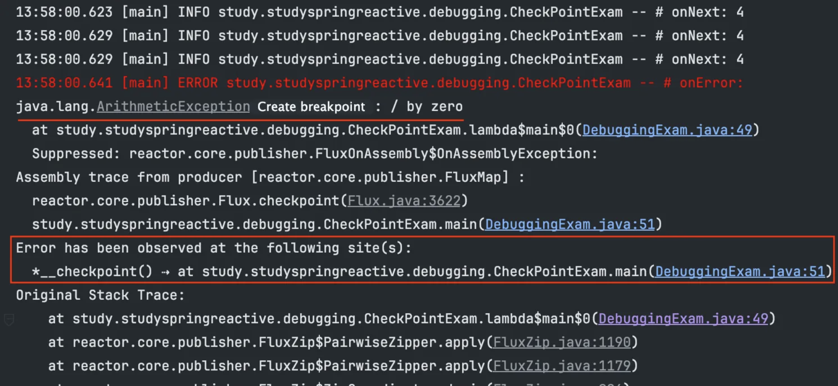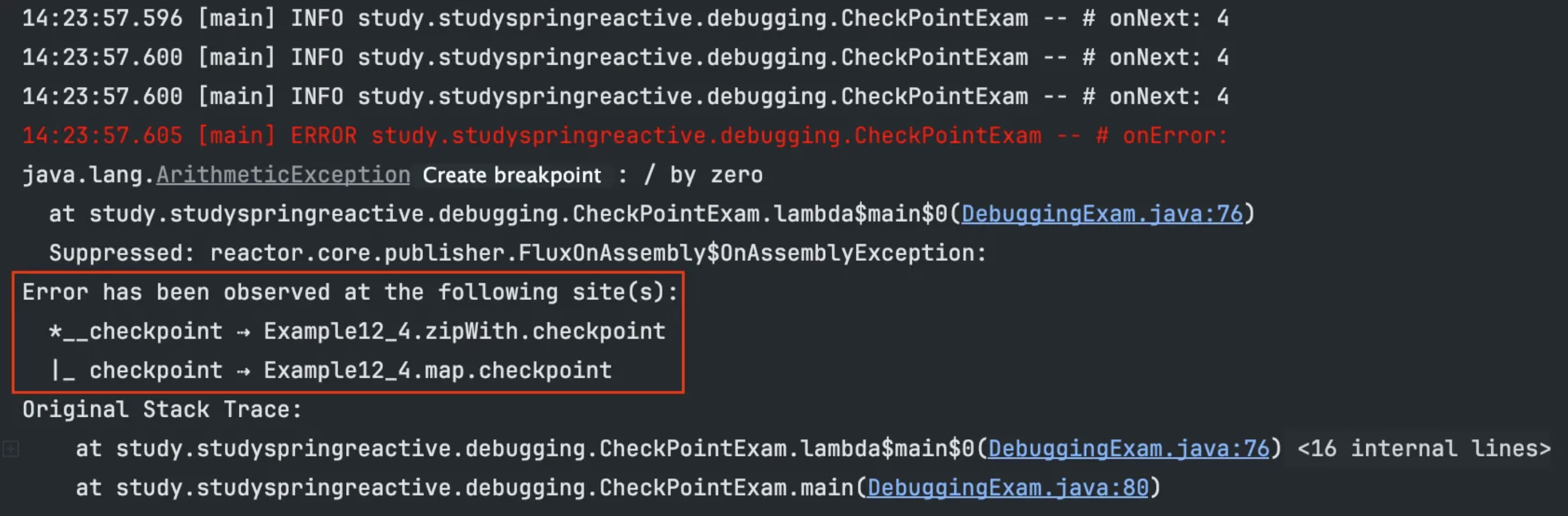 - zipWith() Operator 이전에 checkpoint()는 에러가 전파되지 않았고 이후에는 전파되었음을 알 수 있다.