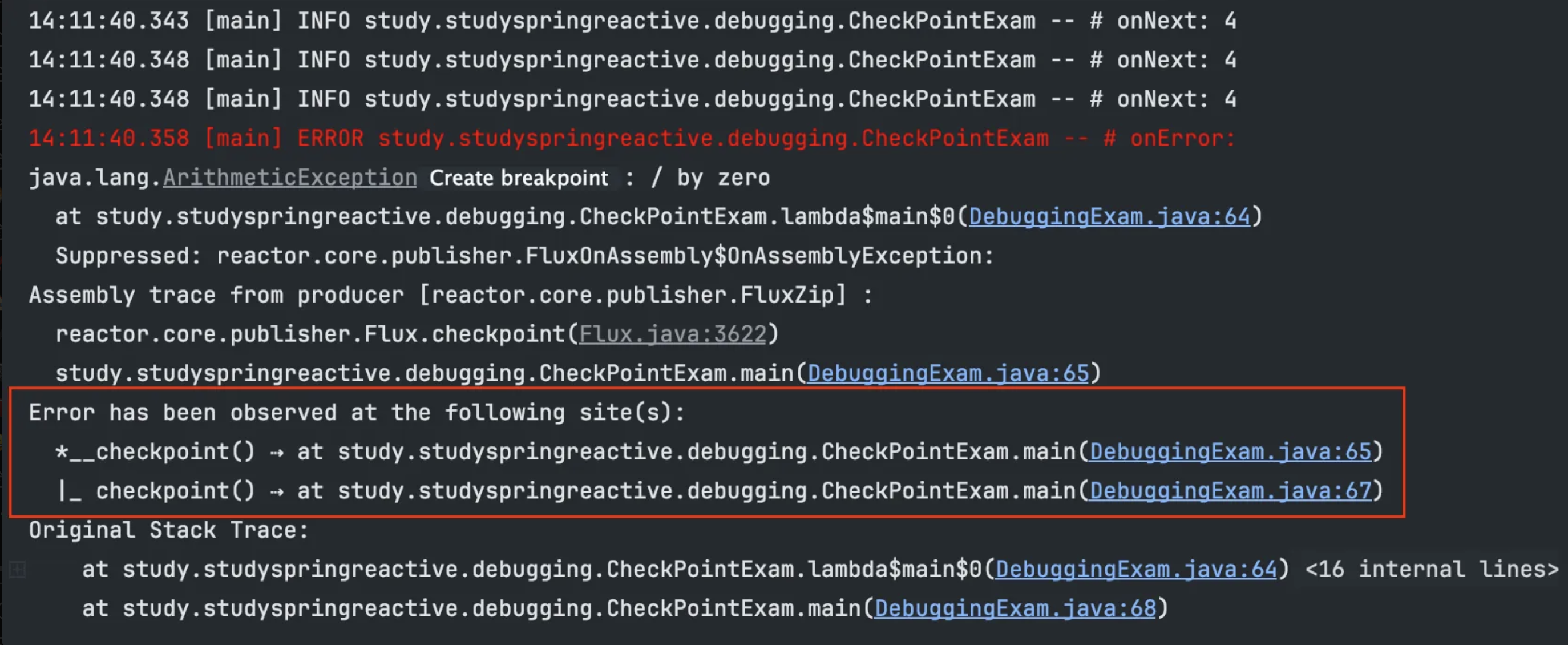 에러가 직접적으로 발생한 지점인지 아니면 에러가 전파된 지점인지 알 수 없지만 map() Operator 다음에 추가한 checkpoint() 지점까지는 에러가 전파되었다는 것을 예상할 수 있다.