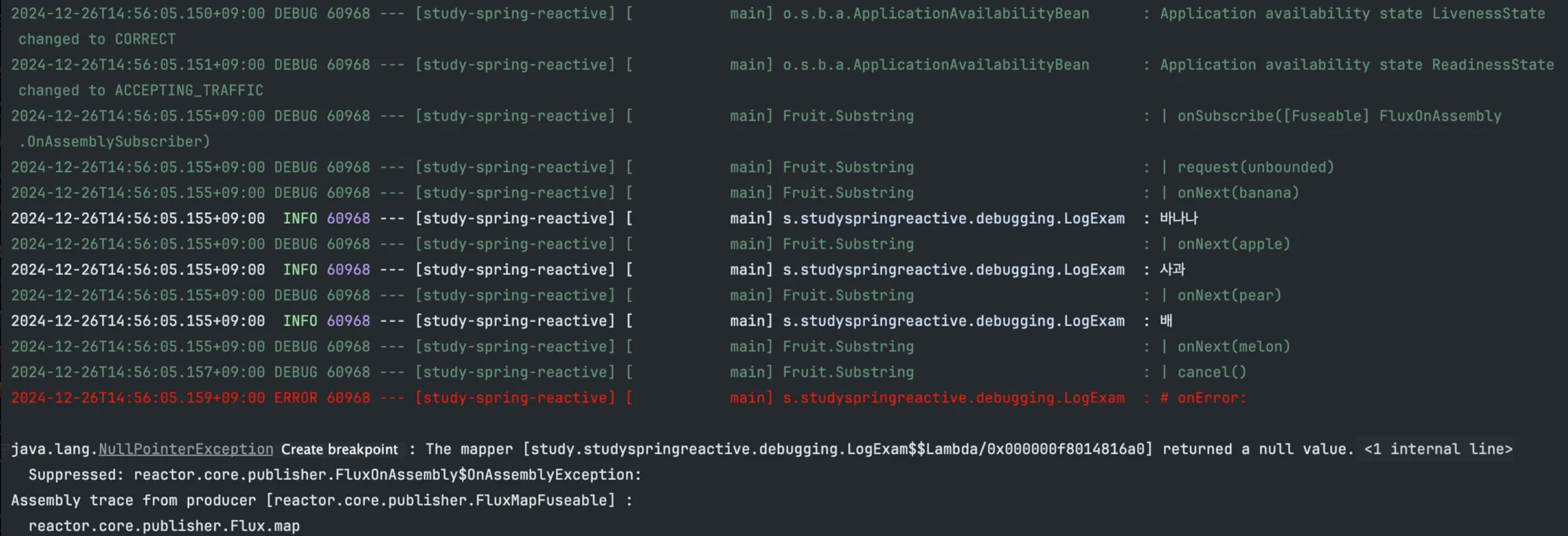 - 두 번째 map() Operator가 melon 이라는 문자열을 emit 했지만 이후의 어떤 지점에서 문자열을 처리하는 중에 에러가 발생했음을 알 수 있다.